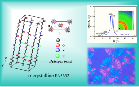 貴大新聞網(wǎng)訊(材料與冶金學(xué)院)近日,我校材料與冶金學(xué)院劉玉飛特聘教授團隊在生物基聚酰胺材料研究領(lǐng)域取得重要突破,相關(guān)成果以 Biobased Polyamide 5652 with α?Crystal Form: Characterization and Low Moisture Absorption為題,發(fā)表于高分子領(lǐng)域頂級期刊Macromolecules(自然指數(shù)期刊,中科院一區(qū)TOP)。貴州大學(xué)材料與冶金學(xué)院為論文第一完成單位,材料與冶金學(xué)院2022級碩士研究生王艷平為第一作者,劉玉飛特聘教授為通訊作者。近年來,生物基聚酰胺56(PA56)因其原料可再生、低碳環(huán)保而備受關(guān)注,但其特殊的分子結(jié)構(gòu)(戊二胺單元含奇數(shù)碳原子)導(dǎo)致其晶體通常以γ晶型為主,飽和吸水率高達12%以上,在潮濕環(huán)境中力學(xué)性能顯著下降(如拉伸強度降低20%-30%),嚴重限制了在精密工程領(lǐng)域的應(yīng)用,而傳統(tǒng)改性方法往往以犧牲材料其他性能為代價。針對這一難題,劉玉飛特聘教授創(chuàng)新性地提出了雙氫鍵結(jié)構(gòu)調(diào)控策略:自主合成關(guān)鍵單體,設(shè)計并成功合成新型565二胺單體(C16H34N4O2),將565二胺與草酸二丁酯通過溶液聚合及